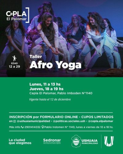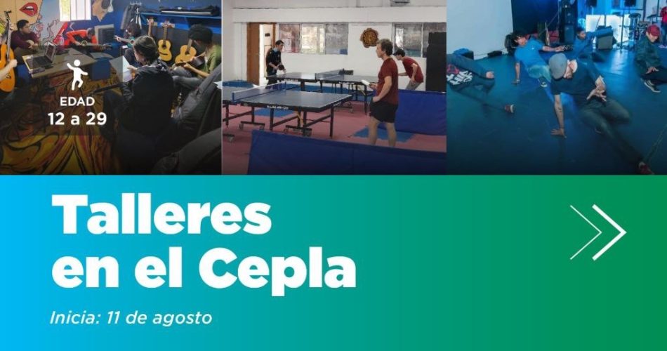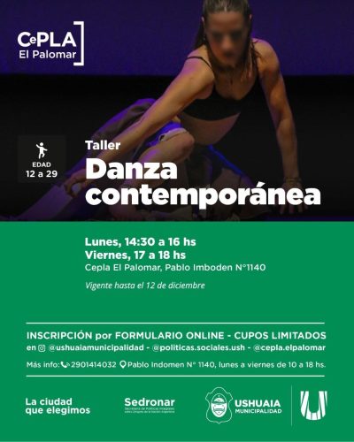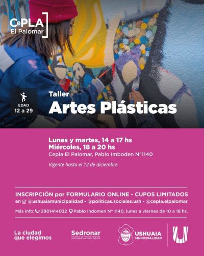 La Municipalidad de Ushuaia, a través de la Secretaría de Políticas Sociales, Sanitarias y Derechos Humanos, invita a adolescentes y jóvenes de 12 a 29 años a participar de los talleres gratuitos que se desarrollan en el CePLA–El Palomar, ubicado en Pablo Imboden 1140 del barrio 245 Viviendas.