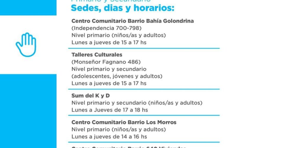Dicha iniciativa, que es parte del programa socioeducativo municipal “Filomena Grasso”, se dictará en cinco sedes de la ciudad, siendo para nivel primario en el Centro Comunitario del Barrio Bahía Golondrina de lunes a jueves de 15:00 a 17:00 horas; en los Talleres Culturales Municipales de calle Fagnano N° 486 para los niveles primario y secundario también de lunes a jueves de 15:00 a 17:00 horas. En el SUM del Barrio K y D habrá clases de apoyo para los niveles primario y secundario de lunes a jueves de 17:00 a 18:00 horas, en el Centro Comunitario del Barrio Los Morros para primario de lunes a jueves de 14:00 a 16:00 horas y en el Centro Comunitario del Barrio 640 Viviendas también para niños, niñas y adultos que cursen sus estudios primarios de lunes a jueves de 14:00 a 16:00 horas.