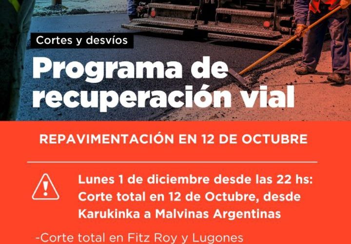 El martes 2 de diciembre, a partir de las 7.30 horas comenzarán los trabajos de fresado en 12 de Octubre, que se desarrollarán en dos tramos: El primero entre Karukinka y Fitz Roy, con una duración aproximada de tres horas, mientras que el segundo tramo será entre Fitz Roy y Avenida Malvinas Argentinas, previsto desde las 11.30 horas en adelante. En tanto, cabe mencionar que se dispondrá el corte de la calle Fitz Roy desde las 16 horas, entre Lugones y 12 de Octubre, para evitar cruces durante las tareas.
