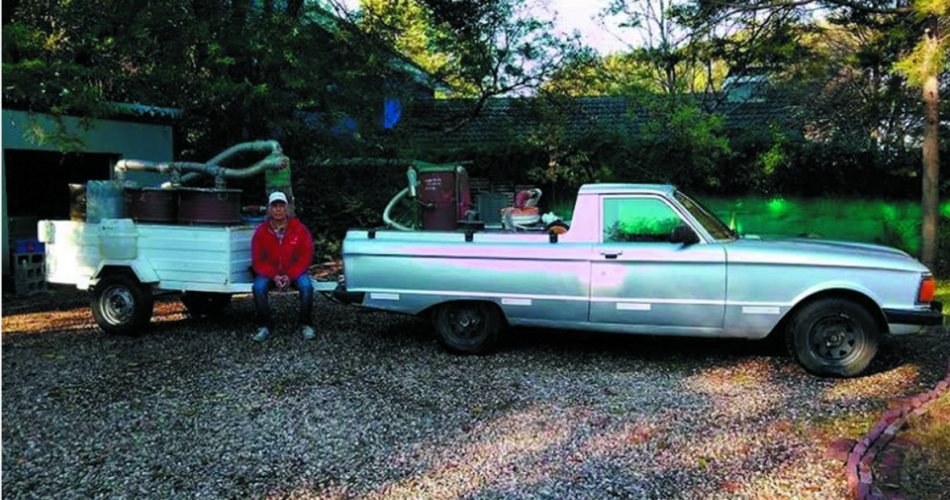 «Por dicha razón, para realizar el trayecto, llevo un remolque que tiene tres gasificadores, que son tres tambores de 200 litros cada uno, lo que me da 500 kilómetros de autonomía. Además, en la caja tengo tres tachos de basura que me dan 1.000 kilómetros de autonomía”, afirma Ramos. “Cada vez que llego a un pueblo, relleno con basura. El mejor residuo es la carbonilla, las cáscaras de nuez y los carozos”.
