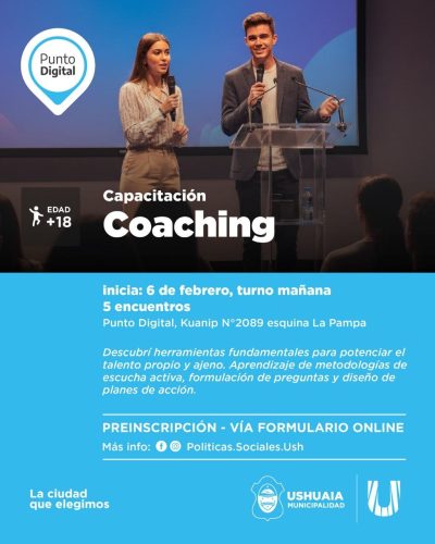 Por su parte, la capacitación Coaching, dirigida a personas mayores de 18 años, inicia el 6 de febrero en turno mañana y se desarrolla a lo largo de cinco encuentros. El espacio brinda herramientas para potenciar el talento propio y ajeno, con contenidos vinculados a la escucha activa, la formulación de preguntas y el diseño de planes de acción.