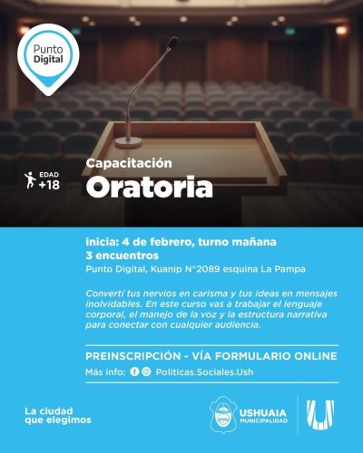 Entre las opciones disponibles se encuentra Oratoria, destinada a personas mayores de 18 años, que inicia el 4 de febrero en turno mañana y consta de tres encuentros. El curso propone trabajar el lenguaje corporal, el manejo de la voz y la estructura narrativa, con el objetivo de mejorar la comunicación frente a distintos públicos.